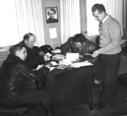 Osa elämäkertaselostuksista lienee kirjoitettu puoluetoimistossa valvovan silmän alla. Kuva: Kansan Arkisto. | ||||||
