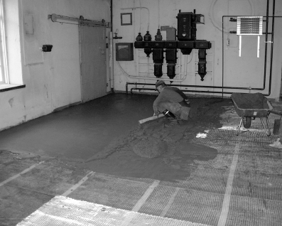TR 2:n uuden näyttelytilan lattia saa massapinnoitteen. Kuva: Työväen keskusmuseo. | |||||